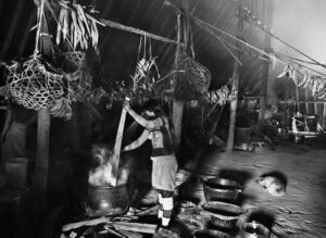 As mulheres se sentam ao centro, em esteiras no chão, com as crianças, e fazem as refeições depois de servirem os homens. Junto à porta dos fundos há um outro tronco, usado como pilão, para triturar alimentos.