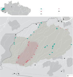 A oeste, no lado peruano do rio Javari, relatórios da agência local antidrogas e do Exército brasileiro apontam desmatamento galopante e ocupação por plantações de coca.